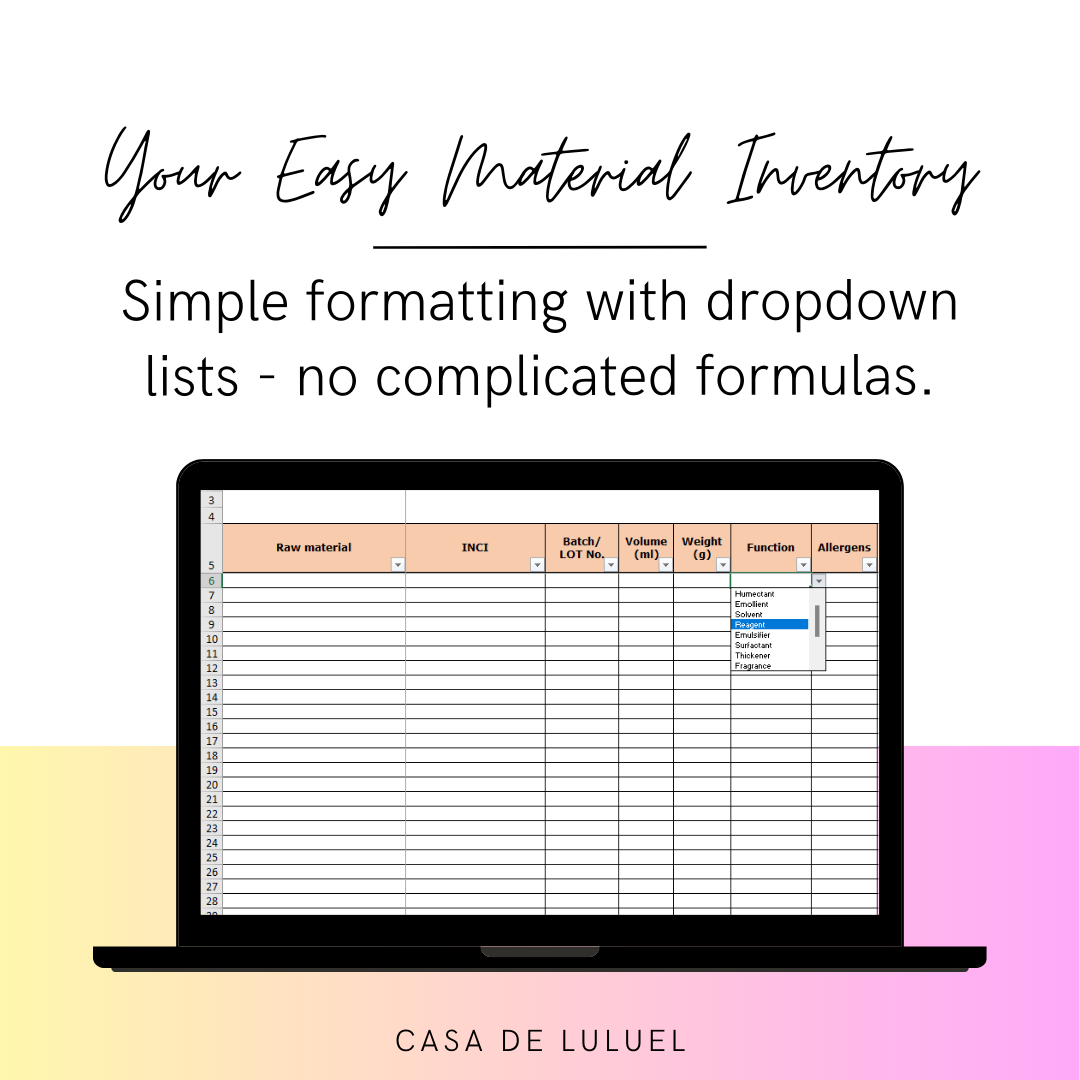Managing a stock inventory is a key element of making and selling quality cosmetic products. Our simple Material Inventory Template helps you to keep up with the ingredient quantities, safety information and expiry dates, but also the stock of packaging materials and disposables used in the manufacturing.