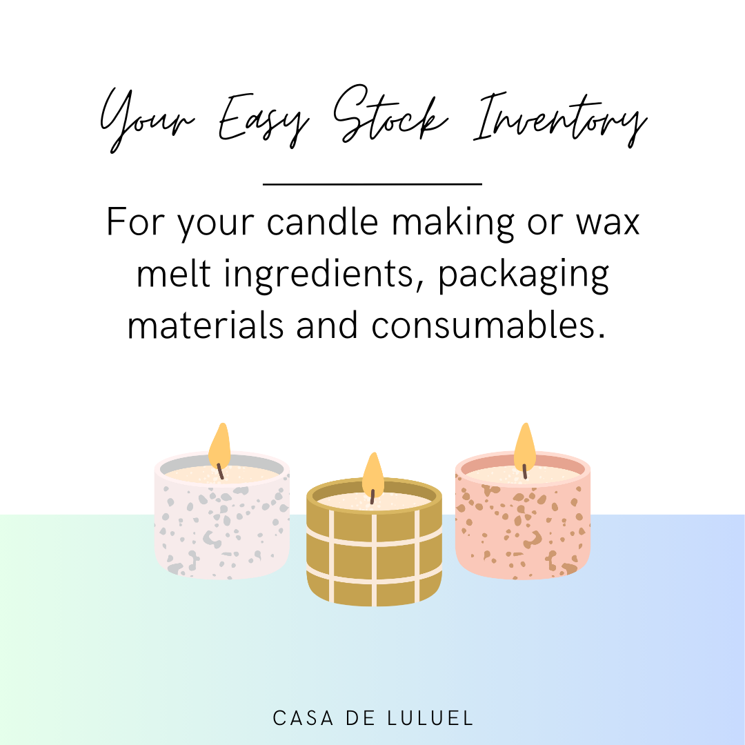 The template consists of 3 sheets: Raw Materials for all your candle making and wax melt ingredients, Consumables for any disposable production materials (i.e. gloves, candle wick stickers), and Packaging Materials for your product packaging and shipping material stock.