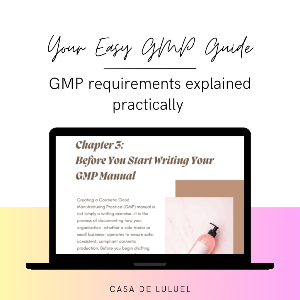 Similar to PIF, a written Good Manufacturing Practice (GMP) is required for any cosmetic products intended for sale in the UK and the European Union. A GMP document is also a tool for fine-tuning your processes and maintaining consistent quality in your cosmetic production.