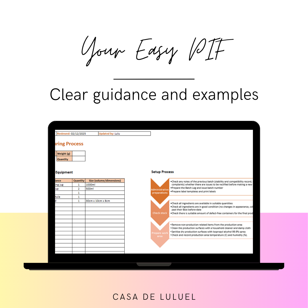 This template suits well for sole traders and home-based micro businesses who want to sell their cosmetic product(s) in the UK or in the EU. Our PIF template is compatible with Microsoft Excel and LibreOffice Calc (OpenOffice).